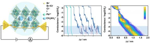 The studies of quantum interference effects through bulk perovskite materials at the Ångstrom scale still remain as a major challenge. Herein, we provide the observation of room-temperature quantum interference effects in metal halide perovskite quantum dots (QDs) using the mechanically controllable break junction technique. Single-QD conductance measurements reveal that there are multiple conductance peaks for the CH3NH3PbBr3 and CH3NH3PbBr2.15Cl0.85QDs, whose displacement distributions match the lattice constant of QDs, suggesting that the gold electrodes slide through different lattice sites of the QD via Au-halogen coupling. We also observe a distinct conductance ‘jump’ at the end of the sliding process, which is further evidence that quantum interference effects dominate charge transport in these single-QD junctions. This conductance ‘jump’ is also confirmed by our theoretical calculations utilizing density functional theory combined with quantum transport theory. Our measurements and theory create a pathway to exploit quantum interference effects in quantum-controlled perovskite materials.