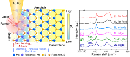 Defects can induce drastic changes of the electronic properties of two-dimensional transition metal dichalcogenides and influence their applications. It is still a great challenge to characterize small defects and correlate their structures with properties. Here, we show that tip-enhanced Raman spectroscopy (TERS) can obtain distinctly different Raman features of edge defects in atomically thin MoS2, which allows us to probe their unique electronic properties and identify defect types (e.g., armchair and zigzag edges) in ambient. We observed an edge-induced Raman peak (396 cm−1) activated by the double resonance Raman scattering (DRRS) process and revealed electron–phonon interaction in edges. We further visualize the edge-induced band bending region by using this DRRS peak and electronic transition region using the electron density-sensitive Raman peak at 406 cm−1. The power of TERS demonstrated in MoS2 can also be extended to other 2D materials, which may guide the defect engineering for desired properties.