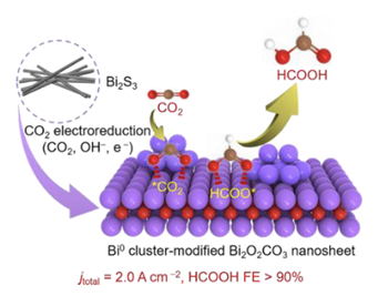 Abstract: As one of the most promising CO2 utilization routes, the renewable electricity-driven CO2 reduction to formic acid would contribute to establishing a carbon-neutral society. The current catalyst suffers from limited activity and stability under high selectivity and the ambiguous nature of active sites. Here, we report a powerful Bi2S3-derived catalyst that demonstrates a current density of 2.0 A cm-2 with a formate Faradaic efficiency of 93% at -0.95 V versus reversible hydrogen electrode. The energy conversion efficiency and single-pass yield of formate reach 80% and 67%, respectively, and the durability reaches 100 h at an industrial-relevant current density. Pure formic acid with a concentration of 3.5 mol L-1 has been produced continuously. Our operando spectroscopic and theoretical studies reveal the dynamic evolution of catalyst into a nanocomposite composed of Bi0 clusters and Bi2O2CO3 nanosheets and the pivotal role of Bi0−Bi2O2CO3 interface in CO2 activation and conversion.