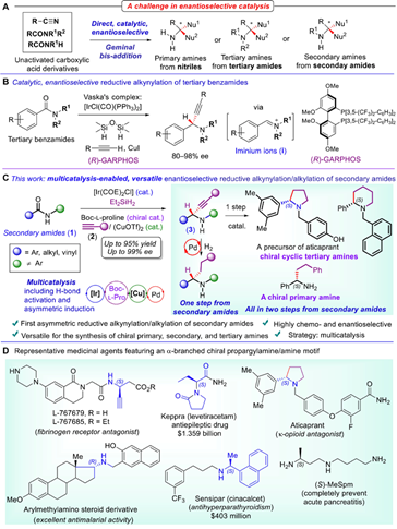 Abstract: The catalytic asymmetric geminal bis-nucleophilic addition to nonreactive functional groups is a type of highly desirable yet challenging transformation in organic chemistry. Here, we report the first catalytic asymmetric reductive/deoxygenative alkynylation of secondary amides. The method is based on a multicatalysis strategy that merges iridium/copper relay catalysis with organocatalysis. A further combination with the palladium-catalyzed alkyne hydrogenation allows the one-pot enantioselective reductive alkylation of secondary amides. This versatile protocol allows the efficient synthesis of four types of α-branched chiral amines, which are prevalent structural motifs of active pharmaceutical ingredients. The protocol also features excellent enantioselectivity, chemoselectivity, and functional group tolerance to be compatible with more reactive functional groups such as ketone and aldehyde. The synthetic utility of the method was further demonstrated by the late-stage functionalization of two drug derivatives and the concise, first catalytic asymmetric approach to the κ-opioid antagonist aticaprant.