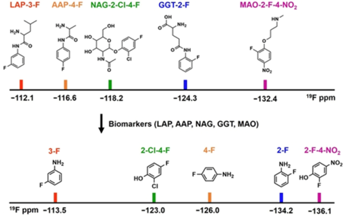 Abstract: Simultaneous detection of multiple biomarkers in complex environments is critical for the in-depth exploration of different biological processes, which is challenging for many current analytical methods due to various limitations. Herein, we report a strategy of 19F barcoding which takes the advantages of 19F's high magnetic resonance (MR) sensitivity, prompt signal response to environmental changes, negligible biological background, quantitative signal output, and multiplex capacity. A set of 19F-barcoded sensors responding to different biomarkers involved in organ injury and cancer are designed, synthesized, and characterized. With these sensors, we accomplish concurrent assessment of different biomarkers in the samples collected from the mice with drug-induced liver/kidney injury or tumor, illustrating the feasibility of this approach for multiplexed detection of different biomarkers in complex environments during various biological processes.