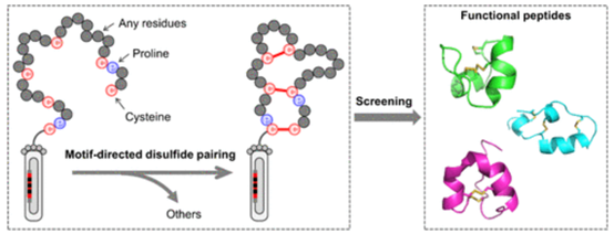 Abstract: Multicyclic peptides with stable 3D structures are a kind of novel and promising peptide formats for drug design and discovery as they have the potential to combine the best characteristics of small molecules and proteins. However, the development of multicyclic peptides is largely limited to naturally occurring products. It remains a big challenge to develop multicyclic peptides with new structures and functions without recourse to the existing natural scaffolds. Here, we report a general and robust method relying on the utility of new disulfide-directing motifs for designing and discovering diverse multicyclic peptides with potent protein-binding capability. These peptides, referred to as disulfide-directed multicyclic peptides (DDMPs), are tolerant to extensive sequence manipulations and variations of disulfide-pairing frameworks, enabling the development of de novo DDMP libraries useful for ligand and drug discovery. This study opens a new avenue for creating a new generation of multicyclic peptides in sequence and structure space inaccessible by natural scaffolds, thus would greatly benefit the field of peptide drug discovery.