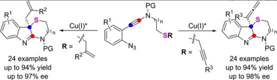 Abstract: [2,3]-Sigmatropic rearrangement reaction involving sulfonium ylide (Doyle–Kirmse reaction) generated from metal carbenes represents one of the powerful methods for the construction of C(sp3)−S and C−C bonds. Although significant advances have been achieved, the asymmetric versions via the generation of sulfonium ylides from metal carbenes have been rarely reported to date, and they have so far been limited to diazo compounds as metal carbene precursors. Here, we describe a copper-catalyzed enantioselective Doyle–Kirmse reaction via azide-ynamide cyclization, leading to the practical and divergent assembly of an array of chiral [1,4]thiazino[3,2-b]indoles bearing a quaternary carbon stereocenter in generally moderate to excellent yields and excellent enantioselectivities. Importantly, this protocol represents a unique catalytic asymmetric Doyle–Kirmse reaction via a non-diazo approach and an unprecedented asymmetric [2,3]-sigmatropic rearrangement via α-imino metal carbenes.