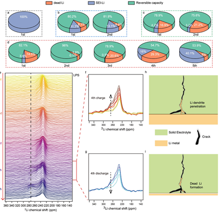 Abstract: The performance of all-solid-state lithium metal batteries (SSLMBs) is affected by the presence of electrochemically inactive (i.e., electronically and/or ionically disconnected) lithium metal and solid electrolyte interphase (SEI), which are jointly termed inactive lithium. However, the differentiation and quantification of inactive lithium during cycling are challenging, and their lack limits the fundamental understanding of SSLMBs failure mechanisms. To shed some light on these crucial aspects, here, we propose operando nuclear magnetic resonance (NMR) spectroscopy measurements for real-time quantification and evolution-tracking of inactive lithium formed in SSLMBs. In particular, we examine four different sulfide-based solid electrolytes, namely, Li10GeP2S12, Li9.54Si1.74P1.44S11.7Cl0.3, Li6PS5Cl and Li7P3S11. We found that the chemistry of the solid electrolyte influences the activity of lithium. Furthermore, we demonstrate that electronically disconnected lithium metal is mainly found in the interior of solid electrolytes, and ionically disconnected lithium metal is found at the negative electrode surface. Moreover, by monitoring the Li NMR signal during cell calendar ageing, we prove the faster corrosion rate of mossy/dendritic lithium than flat/homogeneous lithium in SSLMBs.