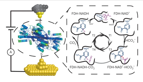 Abstract: Understanding the mechanisms and kinetics of enzymatic reactions is essential for studies of life science and for bioengineering. Here the different reaction states in the catalytic cycle of formate dehydrogenase have been distinguished by their characteristic conductances, using the scanning tunnelling microscope break-junction technique, and these conductances have been further exploited as markers to monitor the catalytic mechanism of formate dehydrogenase from Candida boidinii. Combined with multiscale simulations, we demonstrate that the bound reduced form of nicotinamide adenine dinucleotide (NADH) converts to nicotinamide adenine dinucleotide (NAD+) directly via a hydride-transfer reaction in situ during the catalytic cycle of formate dehydrogenase. This conversion does not proceed via the apoenzyme state invoked in the conventional, generally accepted Theorell–Chance mechanism. This work provides intriguing insight into the mechanism of formate dehydrogenase and highlights the potential of the single-molecule technique in revealing the catalytic mechanism of NADH/NAD+-dependent oxidoreductases.