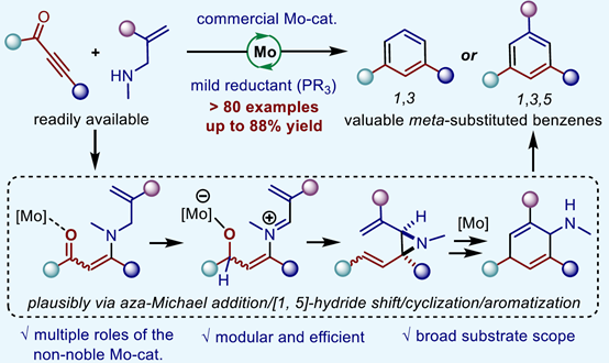 Abstract: The substituted benzene derivatives are essential to organic synthesis, medicinal chemistry, and material science. However, the 1,3-di- and 1,3,5-trisubstituted benzenes are far less prevalent in small-molecule drugs than other substitution patterns, likely due to the lack of robust, efficient, and convenient synthetic methods. Here, we report a Mo-catalyzed intermolecular deoxygenative benzene-forming reaction of readily available ynones and allylic amines. A wide range of unsymmetric and unfunctionalized 1,3-di- and 1,3,5-trisubstituted benzenes were obtained in up to 88% yield by using a commercially available molybdenum catalyst. The synthetic potential of the method was further illustrated by synthetic transformations, a scale-up synthesis, and derivatization of bioactive molecules. Preliminary mechanistic studies suggested that this benzene-forming process might proceed through a Mo-catalyzed aza-Michael addition/[1,5]-hydride shift/cyclization/aromatization cascade. This strategy not only provided a facile, robust, and modular approach to various meta-substituted benzene derivatives but also demonstrated the potential of molybdenum catalysis in the challenging intermolecular deoxygenative cross-coupling reactions.