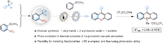 Abstract: Acridine frameworks stand as pivotal architectural elements in pharmaceuticals and photocatalytic applications, owing to their chemical adaptability, biological activity, and unique excited-state dynamics. Conventional synthetic routes often entail specialized starting materials, anaerobic or moisture-free conditions, and elaborate multi-stage manipulations for incorporating diverse functionalities. Herein, we present a convergent approach integrating photo-excitation of readily available ortho-alkyl nitroarenes with copper-promoted cascade annulation. This innovative system enables an aerobic, one-pot reaction of o-alkyl nitroarenes with arylboronic acids, thereby streamlining the modular construction of a wide array of acridine dervatives with various functional groups. This encompasses symmetrical, unsymmetrical and polysubstituted varieties, some of which are otherwise exceptionally difficult to synthesize. Furthermore, it significantly improves the production of structurally varied acridinium salts, featuring enhanced photophysical properties, high excited state potentials (E*red = 2.08−3.15 V), and exhibiting superior performance in intricate photoredox transformations.