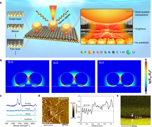 Abstract: Graphene has been extensively utilized as an electrode material for nonaqueous electrochemical capacitors. However, a comprehensive understanding of the charging mechanism and ion arrangement at the graphene/electrolyte interface remain elusive. Herein, a gap-enhanced Raman spectroscopic strategy is designed to characterize the dynamic interfacial process of graphene with an adjustable number of layers, which is based on synergistic enhancement of localized surface plasmons from shell-isolated nanoparticles and a metal substrate. By employing such a strategy combined with complementary characterization techniques, we study the potential-dependent configuration of adsorbed ions and capacitance curves for graphene based on the number of layers. As the number of layers increases, the properties of graphene transform from a metalloid nature to graphite-like behavior. The charging mechanism shifts from co-ion desorption in single-layer graphene to ion exchange domination in few-layer graphene. The increase in area specific capacitance from 64 to 145 µF cm–2 is attributed to the influence on ion packing, thereby impacting the electrochemical performance. Furthermore, the potential-dependent coordination structure of lithium bis(fluorosulfonyl) imide in tetraglyme ([Li(G4)][FSI]) at graphene/electrolyte interface is revealed. This work adds to the understanding of graphene interfaces with distinct properties, offering insights for optimization of electrochemical capacitors.