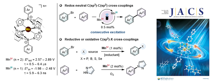 Abstract: Manganese complexes stand out as promising candidates for photocatalyst design, attributed to their eco- and biocompatibility, versatile valence states, and capability for facilitating multiple electronic excitations. However, several intrinsic constraints, such as inadequate visible light response and short excited-state lifetimes, hinder effective photoinduced electron transfer and impede photoredox activation of substrates. To overcome this obstacle, we have developed a class of manganese complexes featuring boron-incorporated N-heterocyclic carbene ligands. These complexes enable prolonged excited-state durations encapsulating both Mn(IV) and Mn(III) oxidation stages, with lifetimes reaching microseconds for Mn(IV) and nanoseconds for Mn(III), concurrently exhibiting robust redox capabilities. They efficiently catalyze direct, site-selective cross-couplings between diverse arenes and aryl bromides, at a low catalyst loading of 0.5 mol %. Their proficiency spans an extensive array of substrates including both highly electron-rich and electron-deficient molecules, which underscore the superior performance of these manganese complexes in tackling intricate transformations. Furthermore, the versatility of these complexes is further highlighted by their successful applications in various photochemical transformations, encompassing reductive cross-couplings for the formation of C–P, C–B, C–S and C–Se bonds, alongside oxidative couplings for creating C–N bonds. This study sheds light on the distinctive photoredox properties and the remarkable catalytic flexibility of manganese complexes, highlighting their immense potential to drive progress in photochemical synthesis and green chemistry applications.