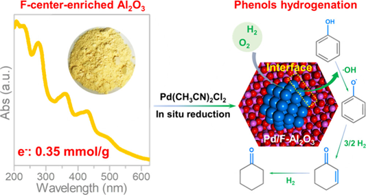 Abstract: The prevalence of electronic defects has not been successfully demonstrated in nonreducible oxides. This work presents a straightforward approach to the preparation of a yellow alumina rich in F-centers (oxygen vacancies containing free electrons), which is well characterized by systematic spectral methods. The surface electron density of the as-prepared F-center enriched alumina sample was estimated to be approximately 0.35 mmol·g–1. Free electrons on the surface can reduce palladium precursors in situ, leading to the deposition of fine Pd nanoparticles on alumina. The produced Pd nanocatalysts are highly effective in the selective hydrogenation of phenol to cyclohexanone, achieving a high catalytic performance under mild conditions (30 °C and 0.1 MPa of H2). Systematic mechanism investigations reveal that hydroxyl radicals generated at the catalyst interfaces facilitate the activation of phenol. The activated phenol is then sequentially hydrogenated to give the intermediate 2-cyclohexenone and then the desired cyclohexanone. The catalyst system demonstrates efficacy in selectively hydrogenating substituted phenols into a wide array of functional ketones.