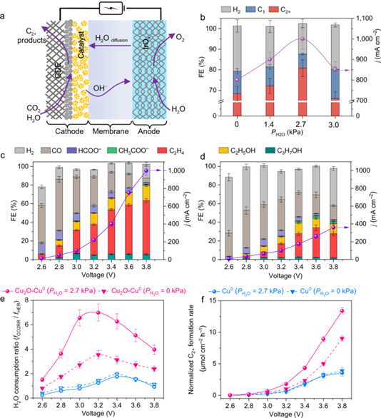 Abstract: The membrane electrode assembly (MEA) is promising for practical applications of the electrocatalytic CO2 reduction reaction (CO2RR) to multi-carbon (C2+) compounds. Water management is crucial in the MEA electrolyser without catholyte, but few studies have clarified whether the co-feeding water in cathode can enhance C2+ formation. Here, we report our discovery of pivotal roles of a suitable nanocomposite electrocatalyst with abundant Cu2O−Cu0 interfaces in accomplishing water-promoting effect on C2+ formation, achieving a current density of 1.0 A cm−2 and a 19% single-pass C2+ yield at 80% C2+ Faradaic efficiency in MEA. The operando characterizations confirm the co-existence of Cu+ with Cu0 during CO2RR at ampere-level current densities. Our studies reveal that Cu+ works for water activation and aids C‒C coupling by enhancing formations of adsorbed CO and CHO species. This work offers a strategy to boost CO2RR to C2+ compounds in industrial-relevant MEA by combining water management and electrocatalyst design.