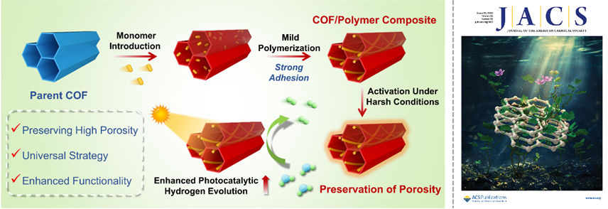 Abstract: Due to their high structural tunability, remarkable internal surface areas, readily accessible pore space, and host of possible applications, covalent organic frameworks (COFs) remain at the forefront of materials science research. Unfortunately, many COFs suffer from structural distortions or pore collapse during activation, which can lead to a substantial loss of crystallinity and functionality. Thus, herein, we demonstrate a facile method to address this issue by introducing polymer guests. The polymer adheres to the COF internal pore wall, acting as a supporting pillar during activation and effectively preserving the COF porosity and crystallinity. In fact, the surface area of one COF/polymer composite, known as TAPB-TA/PDA, was boosted by a factor of 16 when compared to the parent COF, TAPB-TA. More importantly, the now robust COF structure was able to resist layer shifting and order loss during both solvent immersion and removal. The introduction of functional polymer guests not only solidifies the COF structure and preserves its high porosity but is also shown to enhance the transport and separation of photogenerated charge carriers, thereby facilitating hydrogen evolution during photocatalytic water splitting. Molecular dynamics simulations further support experimental observations that the incorporation of PDA within the COF pores reinforces the walls, preventing its collapse. The proposed mechanism is based on the adsorption of PDA oligomers along the c direction of the unit cell, fastening the COF layers in place via van der Waals interactions. This kind of interaction locks −N═CH–Ph–CH═N– units in a trans-configuration in the COF pores.