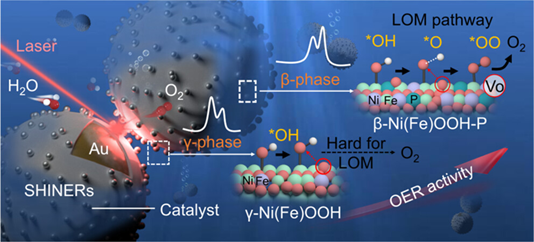 Abstract: Nickel–iron-based catalysts are recognized for their high efficiency in the oxygen evolution reaction (OER) under alkaline conditions, yet the underlying mechanisms that drive their superior performance remain unclear. Herein, we revealed the molecular OER mechanism and the structure-intermediate-performance relationship of OER on a phosphorus-doped nickel–iron nanocatalyst (NiFeP). NiFeP exhibited exceptional activity and stability with an overpotential of only 210 mV at 10 mA cm–2 in 1 M KOH and a cell voltage of 1.68 V at 1 A cm–2 in anion exchange membrane water electrolyzers. The evolution of active sites and intermediates during OER on NiFeP was in situ probed and correlated using shell-isolated nanoparticle-enhanced Raman spectroscopy, complemented by differential electrochemical mass spectrometry and density functional theory. These results provide direct evidence that OER proceeds via the lattice oxygen-mediated mechanism. Remarkably, phosphorus doping plays a critical role in stabilizing the active β-Ni(Fe)OOH phase, which facilitates the *OH deprotonation and the subsequent O–O coupling to form *OO intermediates. Our findings offer a deeper understanding of the OER mechanism, providing a clear pathway for designing next-generation OER catalysts with improved efficiency and durability.