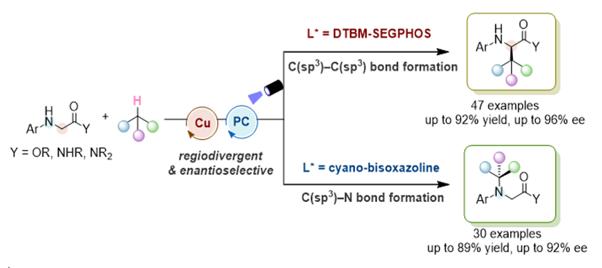 Abstract: Regiodivergent asymmetric synthesis represents a transformative strategy for the efficient generation of structurally diverse chiral products from a single set of starting materials, significantly enriching their enantiomeric composition. However, the design of radical-mediated regiodivergent and enantioselective reactions that can accommodate a wide range of functional groups and substrates has posed significant challenges. The obstacles primarily lie in switching the regioselectivity and achieving high enantiodiscrimination, especially when dealing with high-energy intermediates. To address these issues, we have developed a new catalytic system that integrates photoinduced hydrogen atom transfer (HAT) and chiral copper catalysis, involving the fine-tuning of chiral ligands, additives, and other reaction parameters. The strategy facilitates regiodivergent and enantioselective cross-couplings between N-aryl glycine ester/amide derivatives and abundant hydrocarbon feedstocks through strong C(sp3)–H bond activation. This approach allows for the controlled and stereoselective formation of C(sp3)–C(sp3) and C(sp3)–N bonds, yielding a rich variety of C- or N-alkylated glycine esters and amides with commendable yields (up to 92% yield), exclusive regioselectivities (typically >20:1 rr), and high enantioselectivities (up to 96% ee). Our methodology not only provides a promising avenue for the stereoselective incorporation of alkyl functionalities onto specific sites of biologically significant molecules but also offers a practical approach for regioselectivity switching while simultaneously achieving high asymmetric induction within photochemical reactions.