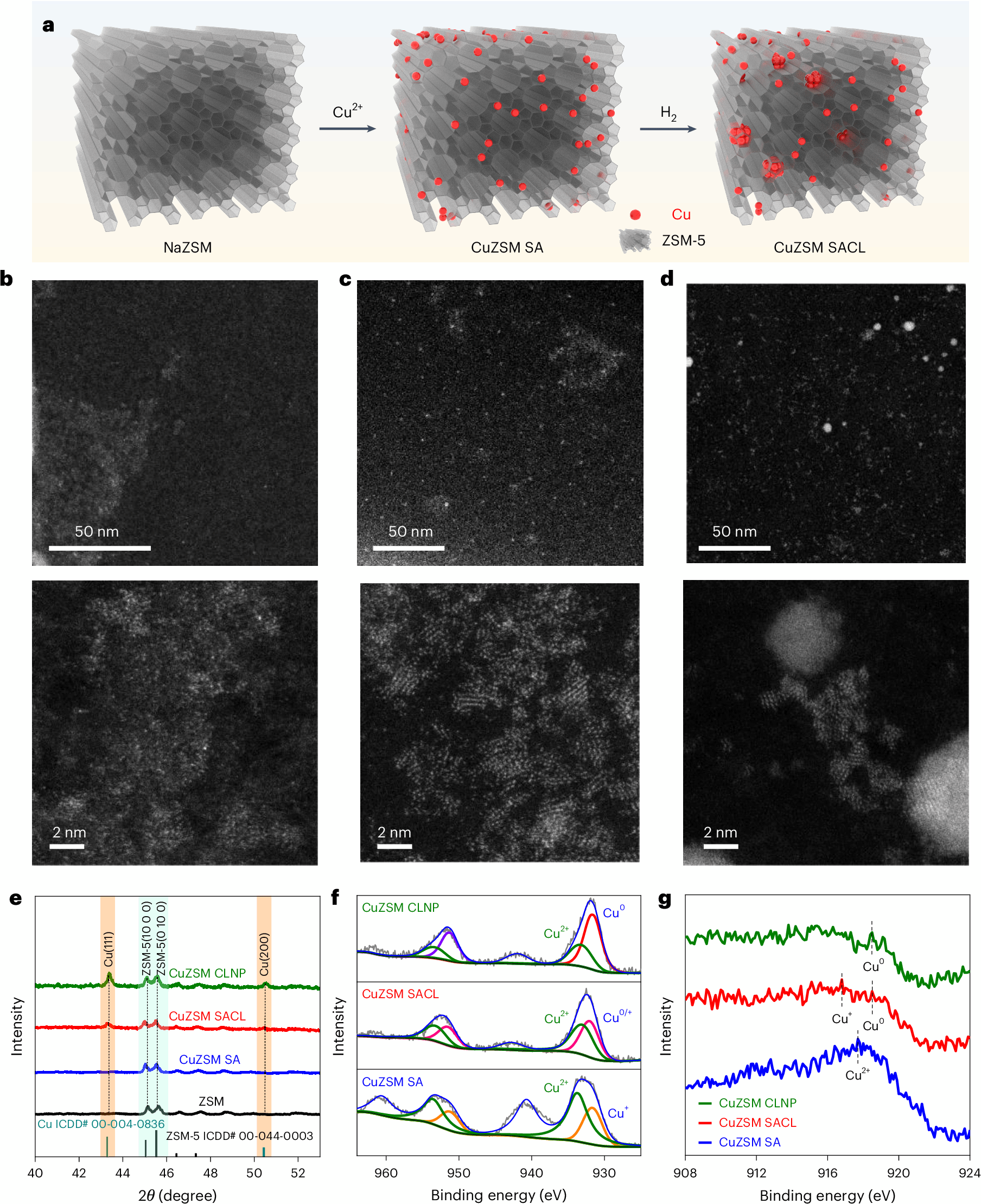Abstract: The electrochemical CO reduction reaction (CORR) has attracted a surge of research interest in sustainably producing high-value multi-carbon products, such as acetate. Nevertheless, most current CORR catalysts exhibit low acetate current densities, poor longevity and limited acetate selectivity. Here we present a Zeolite Socony Mobil-confined Cu single-atom cluster (CuZSM SACL) for CORR, in which Cu SAs are chemically anchored via robust Cu–O–Si bonds while Cu CLs are physically trapped within the porous framework of zeolite cavities. Consequently, the CuZSM SACL-containing membrane electrode assembly enables a remarkable CO-to-acetate current density of 1.8 A cm−2 with a high acetate Faraday efficiency of 71 ± 3%. More importantly, we demonstrate that the Cu-based membrane electrode assembly can stably catalyse CO to acetate at an industrial current density of 1 A cm−2 at 2.7 V (Faraday efficiency 61 ± 5%) beyond 1,000 h at atmospheric pressure. This milestone sheds light on high-performing Cu-type catalysts for practical CORR applications.