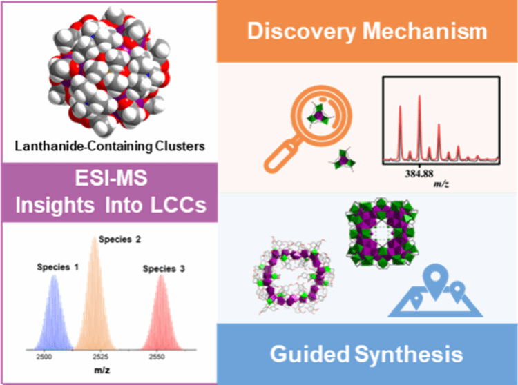 Abstract: Atomically precise metal clusters with well-defined crystal structures have emerged as a rapidly growing field within coordination and materials chemistry. Among them, lanthanide-containing clusters (LCCs) are particularly notable for their aesthetically pleasing architectures and intriguing properties. Achieving precise synthesis and accurate structural characterization of these clusters is crucial for unlocking their potential applications. Mass spectrometry (MS), particularly electrospray ionization mass spectrometry (ESI-MS), has proven to be a powerful tool, providing exceptional sensitivity and clarity in revealing the formation mechanisms and structural details of metal clusters. In this Account, we explore the synthesis, characterization, and assembly mechanisms of LCCs utilizing ESI-MS. We begin by tracing the historical development of LCCs, emphasizing the critical role of single-crystal X-ray diffraction in structural confirmation and the challenges associated with it. We then discuss the application of ESI-MS in characterizing LCCs, highlighting how this technique can monitor the formation processes of LCCs and determine their molecular weights and charge states. We introduce the mass difference fingerprint of isomorphism (MDFI) method, which can facilitate rapid analysis of LCCs’ mass spectrometry data. Furthermore, we discuss the state of LCCs in solution and the challenges in their characterization. By utilizing ESI-MS, we enhance the understanding of the assembly mechanisms of LCCs and propose new strategies for designing and synthesizing new LCCs with tailored structures and functions. Looking forward, the ESI-MS method will play increasingly significant roles in LCC research. The continued development of these technologies will deepen the understanding of the structure–property relationships. With the ongoing convergence of computational chemistry and information science, we anticipate more precise design and synthesis of LCCs, leading to broader applications in magnetism, optics, and catalysis.