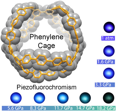 Abstract: A phenylene macrocycle containing two meta-phenylene units positioned opposite each other was used as a building block to construct phenylene cages via platinum-mediated C─C coupling. A phenylene cage (PC[10]3), consisting of three phenylene macrocycle units, was successfully synthesized and thoroughly characterized using nuclear magnetic resonance (NMR) spectroscopy and single-crystal X-ray diffraction. PC[10]3 exhibited significant backbone strain and displayed bright blue emission with a quantum yield of 96%. Additionally, PC[10]3 exhibited a broader and more pronounced piezofluorochromic response compared to its macrocyclic unit, undergoing a distinct photoluminescence shift from blue to yellow–green under pressure. This work opens new avenues for designing and synthesizing hydrocarbon nanocages.