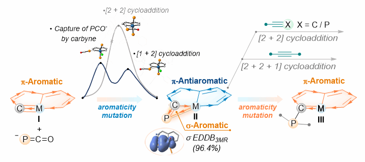 Abstract: Unsaturated phosphorus heterocycles typically exhibit diminished π-aromaticity. A unique entry into metallaphosphirenes featuring σ-aromaticity within an unsaturated framework is reported. Reaction of sodium phosphaethynolate (NaOCP) with cyclic metal carbyne 1 affords phosphorus atom transfer through a formal [1 + 2] cycloaddition pathway. The formation of metallaphosphirene ring was computationally modelled using density functional theory, revealing that [1 + 2] cycloaddition involves direct nucleophilic attack step and, thus, depends on the amphiphilicity of carbyne atom. Comprehensive DFT calculations, including NICS, ACID, GIMIC, EDDB, and NOBD analysis, confirm the predominantly σ-aromatic nature of the metal-based phosphirene system. The reactivity of the metallaphosphirene in cycloaddition reactions is in accord with its σ-aromaticity, which tends to retain the three-membered heterocycle with λ3-P atom.