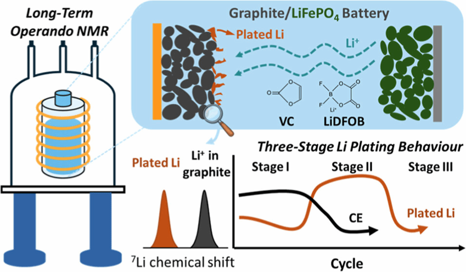 Abstract: Lithium (Li) plating on graphite poses safety concerns for energy storage batteries, and quantifying its evolution in a nondestructive way is important to understand battery degradation pathways. Here, operando variable-temperature electrochemical solid-state 7Li nuclear magnetic resonance (NMR) spectroscopy is used to quantify Li plating (onset, plated amount, reversibility) in LiFePO4/graphite batteries cycled until 30% state of health (SoH) at both 25 and 45 °C with three distinct electrolytes. We find a three-stage Li plating trend across cycles and that Coulombic efficiency (CE) drops are highly correlated to the jump in Li plating and the accumulation of dead Li, as Li plating induces significant electrolyte decomposition and SEI formation. Vinylene carbonate (VC) and Li difluoro(oxalato)borate (LiDFOB) are chosen specifically to generate organic-rich and inorganic solid electrolyte interphase (SEI), respectively. VC suppresses plating and dead Li formation throughout cycling, while LiDFOB initially delays plating but leads to abrupt degradation after decomposition into LiBF4, which is more severe at an elevated temperature. High temperature improves the Li plating reversibility, minimizing dead Li accumulation, yet intensifies SEI formation and results in fewer cycles. Based on our findings, further advice on additives and temperature management for mitigating Li plating is presented.