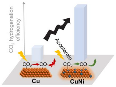 Abstract: The development of efficient, stable, and low-coat plasmonic catalysts for CO2 hydrogenation via the reverse water-gas shift (RWGS) reaction remains a significant challenge. Conventional Cu-based plasmonic catalysts suffer from poor stability due to the valence state fluctuation, nanoparticle sintering, and CO poisoning. Herein, we report a low-cost CuNi bimetallic plasmonic catalyst (CuNi/Al2O3) that address these bottlenecks, achieving a remarkable CO production rate of 4813 µmol/g/h under light irradiation at a relatively low temperature (300 °C), outperforming conventional Cu-based and noble metal catalysts. Systematic experimental and theoretical studies reveal that Ni incorporation enhances catalytic activity and stability by reducing activation energy, maintaining surface valence stability and suppressing nanoparticle sintering. In situ characterization further confirms that light not only drives the CO2 hydrogenation via the localized surface plasmon resonance (LSPR) effect of Cu but also synergizes with Ni to suppress CO poisoning and promote surface reducibility, ensuring long-term stability. This work provides a rational design strategy for low-cost, stable Cu-based plasmonic catalysts and deepens the mechanistic understanding of alloy-mediated plasmonic CO2 conversion, offering insights for advancing solar-driven CO2 valorization.