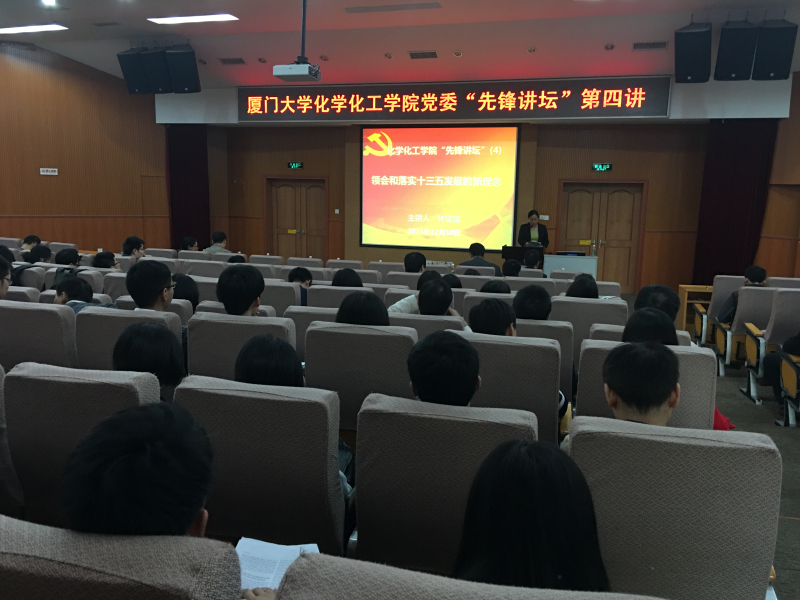 12月10日下午,学院党委“先锋讲坛”第四讲在化学报告厅举行。经济学院林擎国教授十三五发展新理念为主题,为我院师生做了一场党的十八届五中全会精神专题辅导报告。院党政领导、各党支部书记、党员师生近300人参加。报告会由院党委副书记李芬芬主持。