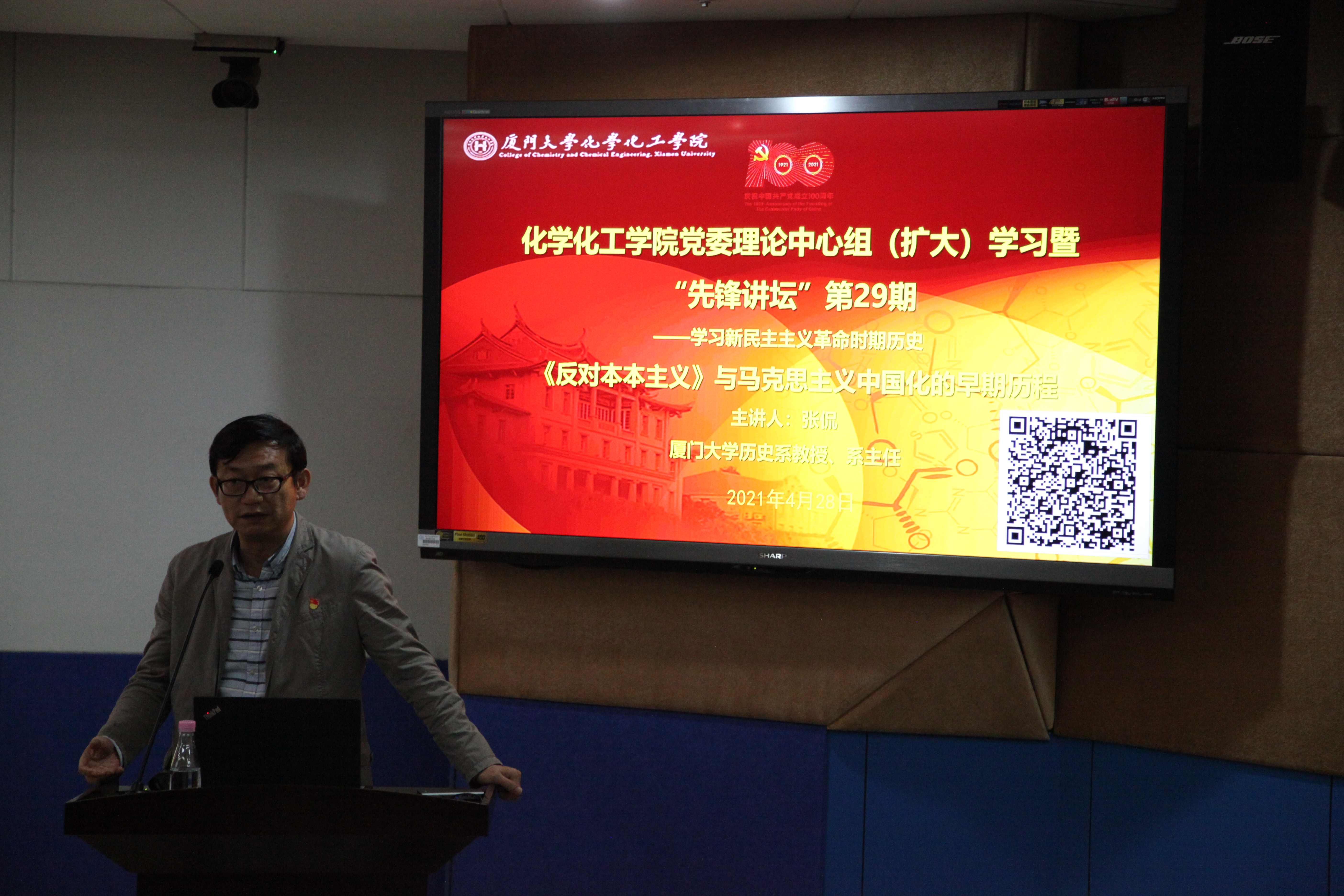 4月28日下午,为深入开展党史学习教育,化学化工学院党委在卢嘉锡楼202报告厅举办党委理论学习中心组学习暨“先锋讲坛”第29期讲座。本期学习主题为新民主主义革命时期历史,讲坛邀请了厦门大学历史系教授、系主任张侃教授为化院师生作题为“《反对本本主义》与马克思主义中国化的早期历程”专题报告。学院党委理论学习中心组组成员、党政领导、各党支部书记、党员和师生等300多人通过线上线下方式参加了本次学习。报告由学院党委副书记李芬芬主持。