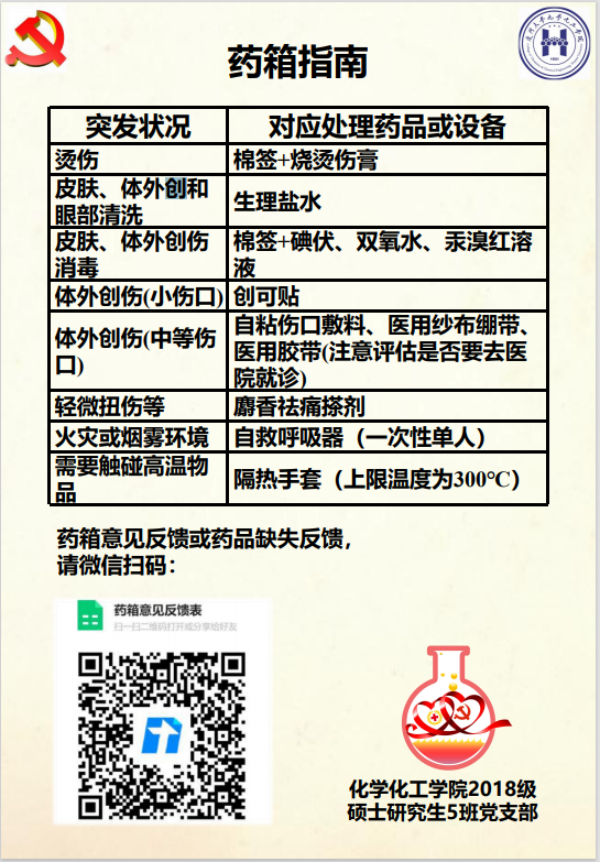 “双一流”的高校,“双一流”的学科不仅有化院师生在科学前沿的谋求创新,更有安全管理处与后勤供应处的“双一流”服务,力求全心全意为师生的科研工作保驾护航。为应对突发情况,防止实验意外对人身安全造成威胁,厦门大学化学化工学院在院楼每个楼层都配置了应急药箱。应急用品包括灭火毯、烧烫伤膏药、碘酊、双氧水、麝香祛痛搽剂等,满足了学院师生应急需求,受到师生的一致好评。