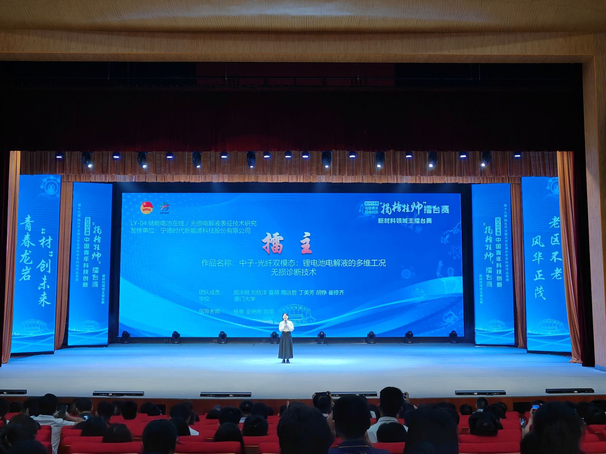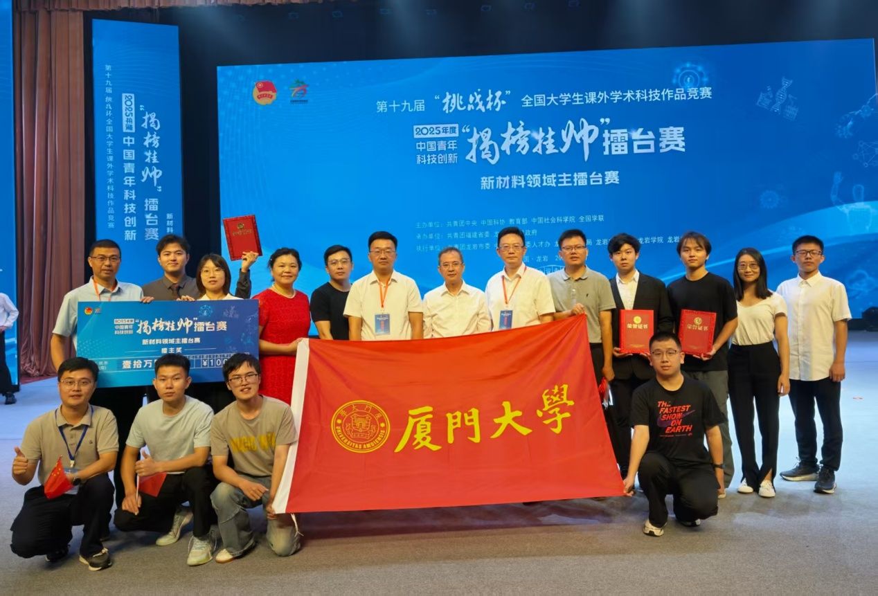 10月10日-12日,第十九届“挑战杯”2025年度中国青年科技创新“揭榜挂帅”新材料领域主擂台赛在龙岩举办。赛事以“青春为中国式现代化挺膺担当”为主题,由共青团中央、中国科协、教育部、中国社会科学院、全国学联联合主办,全国110支参赛团队400余名青年参加比赛。经过激烈角逐,我院双境探微团队“中子-光纤双模态:锂电池电解液的多维工况无损诊断技术”项目斩获小组第一,勇夺“擂主”桂冠和10万元奖金,这是厦门大学在该赛事中获得的首个擂主。