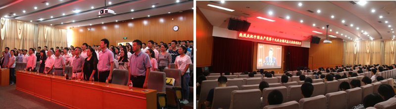 9点整,大会正式开幕。现场师生全体起立,伴随着高昂雄壮的国歌声响起,在场师生齐唱国歌,随后向革命前辈致敬、集体默哀。随后,在李克强总理主持下,习近平总书记代表第十八届中央委员会向大会作了题为“不忘初心、牢记使命,高举中国特色社会主义伟大旗帜,决胜全面建成小康社会,夺取新时代中国特色社会主义伟大胜利,为实现中华民族伟大复兴的中国梦不懈奋斗”的报告。报告中,在场师生聚精会神听报告、全神贯注作笔记,仿佛置身于大会现场聆听报告,不时激动,不时自豪,不时骄傲,表现出了对党的无限热爱和对中国共产党第十九次全国代表大会的热切期待。