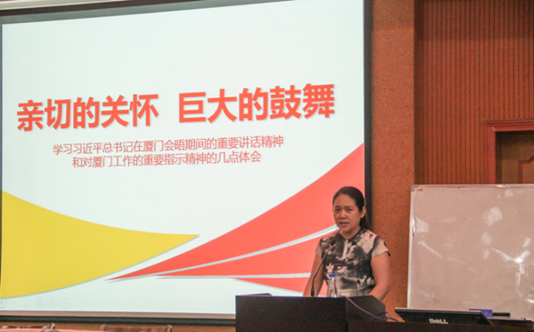 全场师生听后都欢欣鼓舞,十分振奋,大家都深深地感受到习近平总书记的领袖风采和他的为民情怀,感受到了他对厦门这块土地的眷念和热爱,感受到了他与厦门的深厚感情和不解之缘,大家无不为自己生活在厦门而感到荣幸和自豪,也增强了为建设厦门更美好的明天奉献自己一份微薄力量的信心和决心。大家一致认为,习近平总书记对厦门的关怀厚爱和殷切嘱托为厦门发展指明了方向、增强了动力,是全市人民开始新征程的强大精神动力和行动纲领。