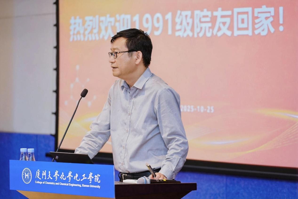 潘宝柱在致辞中深情回顾了与同学们在化学系共同求学的青春岁月,并展望了学院未来的发展图景。他指出,化学作为厦门大学的传统优势学科,正迎来前所未有的发展机遇。他强调,厦门大学聚力推进“双一流”建设,奋力开拓高质量发展新局面,离不开每一位校友的持续奋斗与无私奉献。“自强不息、止于至善”的校训精神,历经三十载光阴淬炼,依然熠熠生辉,深深烙印在每一位学子的成长轨迹中,必将为母校发展注入源源不断的奋进力量。