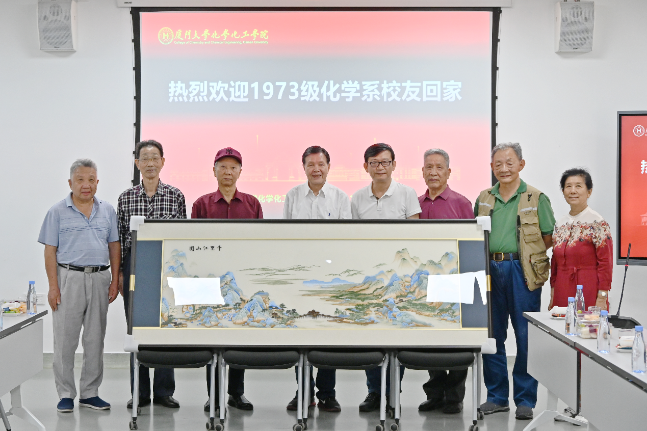 会上举行赠画仪式。1973级化学系催化专业全体校友向学院赠送一副精美的千里江山图苏绣挂画,寓意祝福母院在新的百年征程奋跃千里、再展宏图。