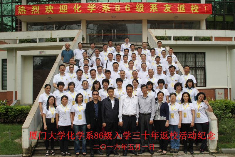 2016年5月1日,化学系86级校友时隔三十年后重返母校,于化学化工学院齐聚一堂,共叙青春往事。校友们参访化学楼、实验室、宿舍楼,找寻昔日求学记忆;参观新型科研平台和实验设备,感受今日学院发展。院长江云宝教授,院党委书记林辉,副院长张昌胜,院工会主席阮源萍教授,院党委副书记李芬芬、刘俊杰等参与了此次活动,与校友们一同分享宝贵的母校情、同窗谊。