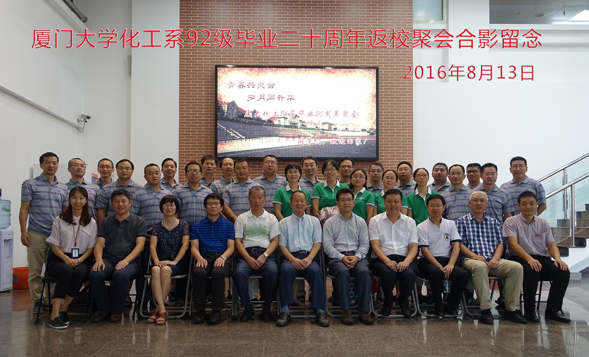 2016年8月13日上午9:30,以“青春共聚合、岁月同升华”为主题的化工系1992级毕业二十周年返校聚会座谈会在卢嘉锡楼202报告厅举行。学院院长江云宝教授,党委书记林辉,副院长李军教授,副院长张昌胜,学院原党委书记林永生,化工系原系主任林国栋、卢英华,原副系主任叶李艺、曹志凯,副系主任吐松等院、系老师应邀一同出席活动。