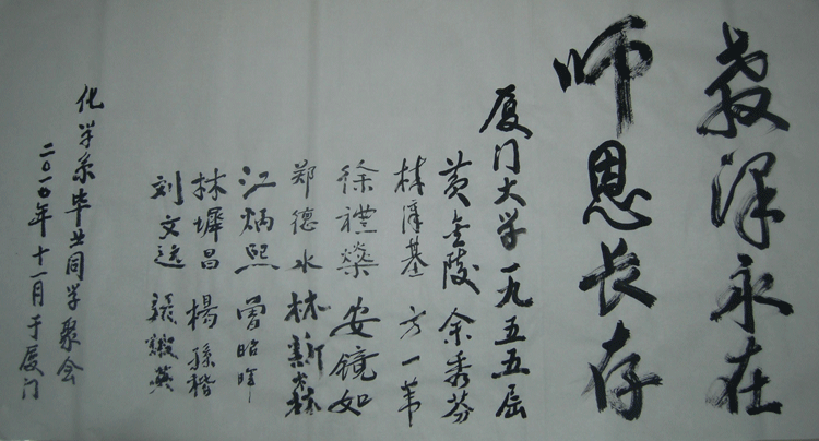 在自由发言阶段,各位校友畅谈离校后55载各自的学习、生活、工作情况,与大家共同分享五十五年来的人生点点滴滴,共同回想当年在校学习的美好岁月。当年的老班长,福州大学原校长、集美大学首任校长黄金陵教授拿出当年毕业合影,回忆起合影中当年他代表同学书赠母校老师“你们的功绩将体现在我们建设祖国的劳动中”的誓言,校友们都感慨万千,半个世纪过去,回首往事,一切历历在目。同时,校友们也为母校母系今天的蓬勃发展感到骄傲,他们衷心祝愿母校、母系繁荣昌盛。
