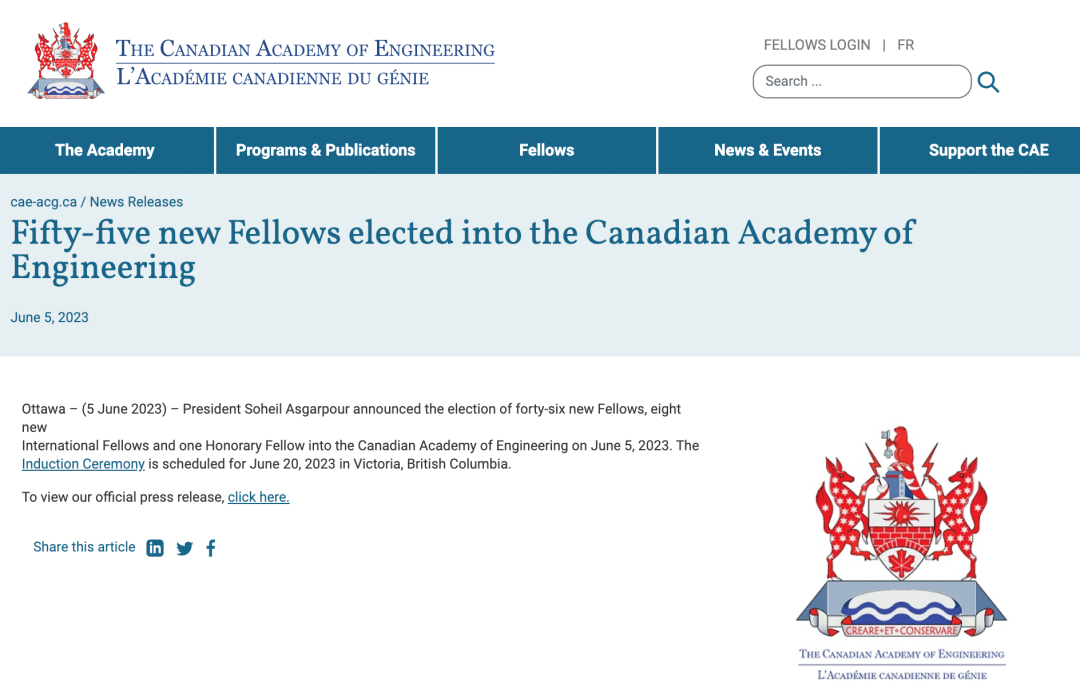 加拿大工程院成立于1987年,是一个独立、自治的非盈利组织,入选人员由同行提名和选举产生,主要标准是参选者在研究领域的杰出成就和在工程专业上的长期服务。