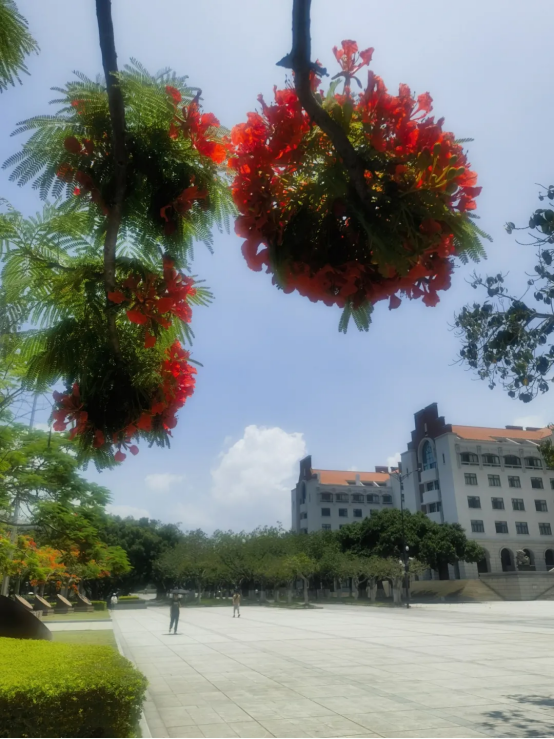 还记得刚入校报到时,校园内遍布着各系的新生报到摊点,挂着红色的欢迎横幅,学哥、学姐们热情的迎接我们这些新生的到来。而那时红满枝头的凤凰花又一次惊艳到了我,这种花是从北方来的我没有见过的,当时心想怎么会有这么美的花,花团锦簇地挂在高高的枝头。她热情似火地怒放着,似乎也在欢迎我们这些刚入校新生的到来。