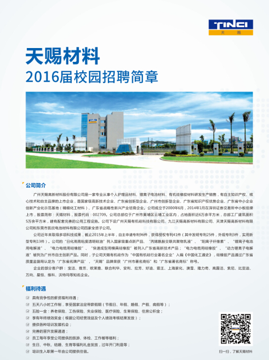广州天赐高新材料股份有限公司是一家专门从事个人护理品材料、锂离子电池材料、有机硅橡胶研发生产销售,有自主研发团队的上市公司,是国家级高新技术企业、广东省创新性企业、广州市创新型企业、广东省知识产权优势企业、广东省中小企业创新产业化示范基地(精细化工材料)、广东省战略性新兴产业培育企业。公司成立于2000年6月,2014年1月在深证证券交易所中小板挂牌上市,股票简称:天赐材料,股票代码为:002709。公司下设广州天赐有机硅科技有限公司、九江天赐高新材料有限公司、天津天赐高新材料有限公司和东莞市凯欣电池材料有限公司四家全资子公司。