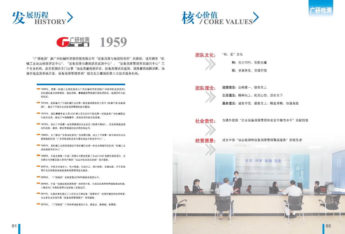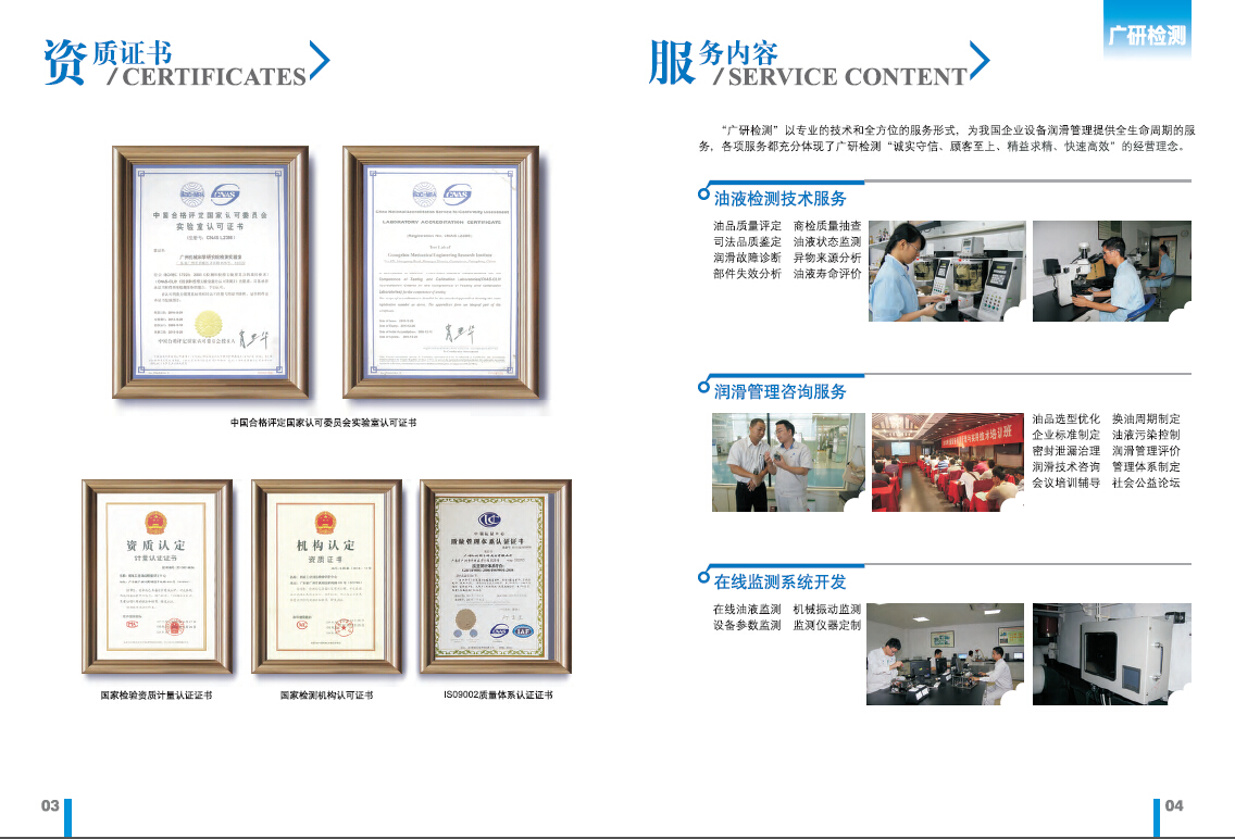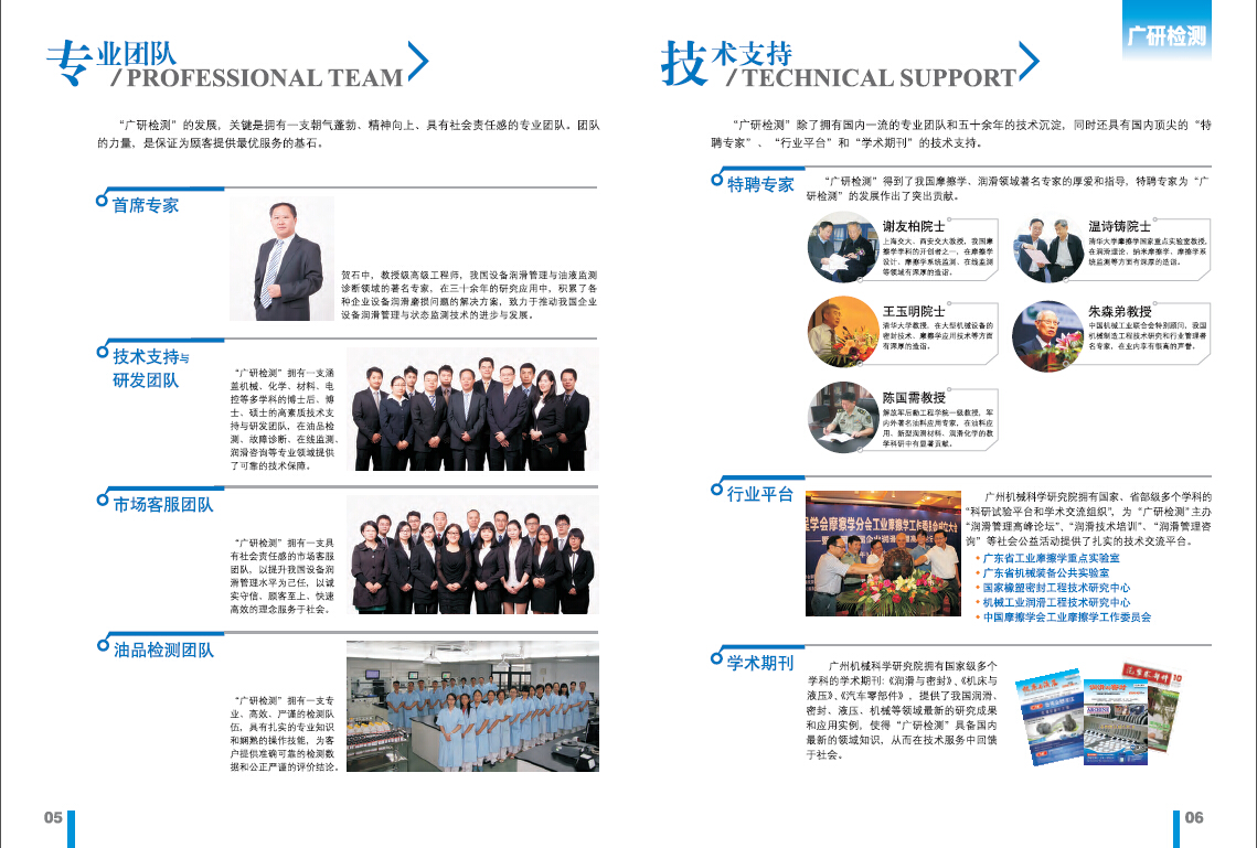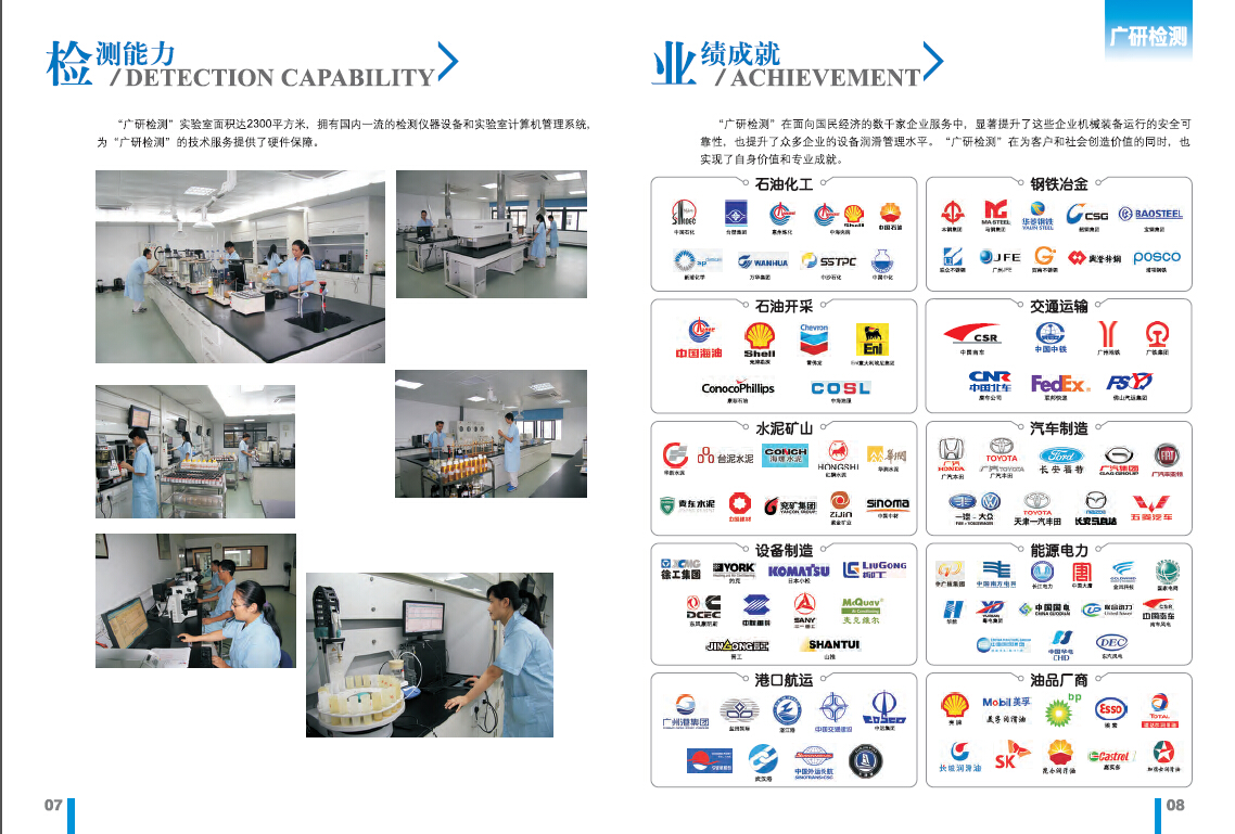 “广研检测” 拥有油品检验评定及设备润滑磨损状态监测的资深专家和一支高素质的技术队伍。多年来,与德国、英国、芬兰、澳大利亚等国在设备润滑、摩擦学领域进行了长期的技术交流和合作,完成了国家多项重点科技攻关项目并获得多项科技进步奖。功能齐全的现代化实验室和先进的分析检测仪器,为油品检验评定和设备润滑磨损工况监测技术服务提供了有力的资源保证。