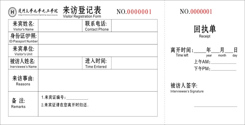 1. 所有访客必须如实填写访客登记表,并向门卫出示有效证件,经门卫核准后才可进入化学楼和卢嘉锡楼实验室;