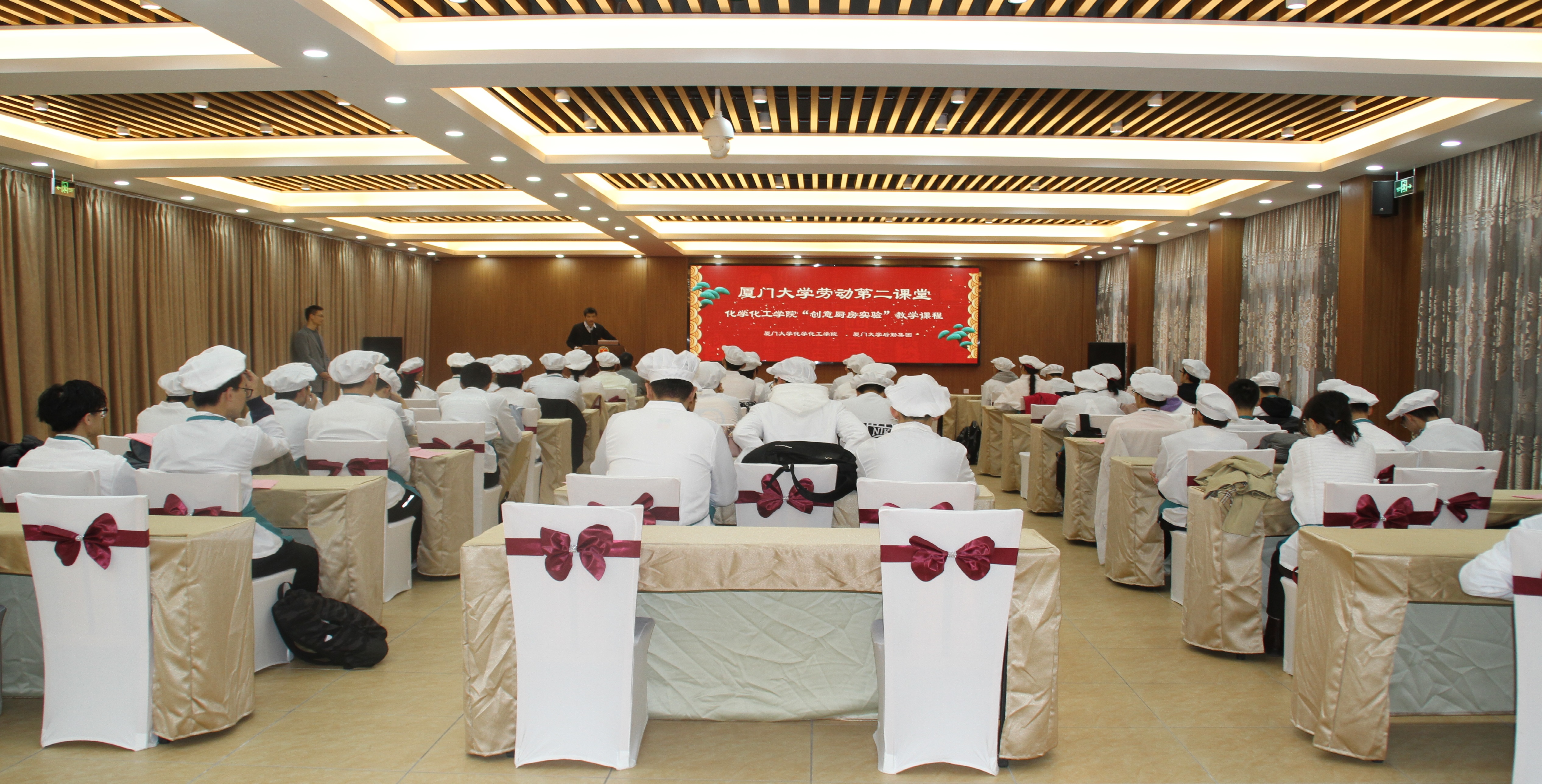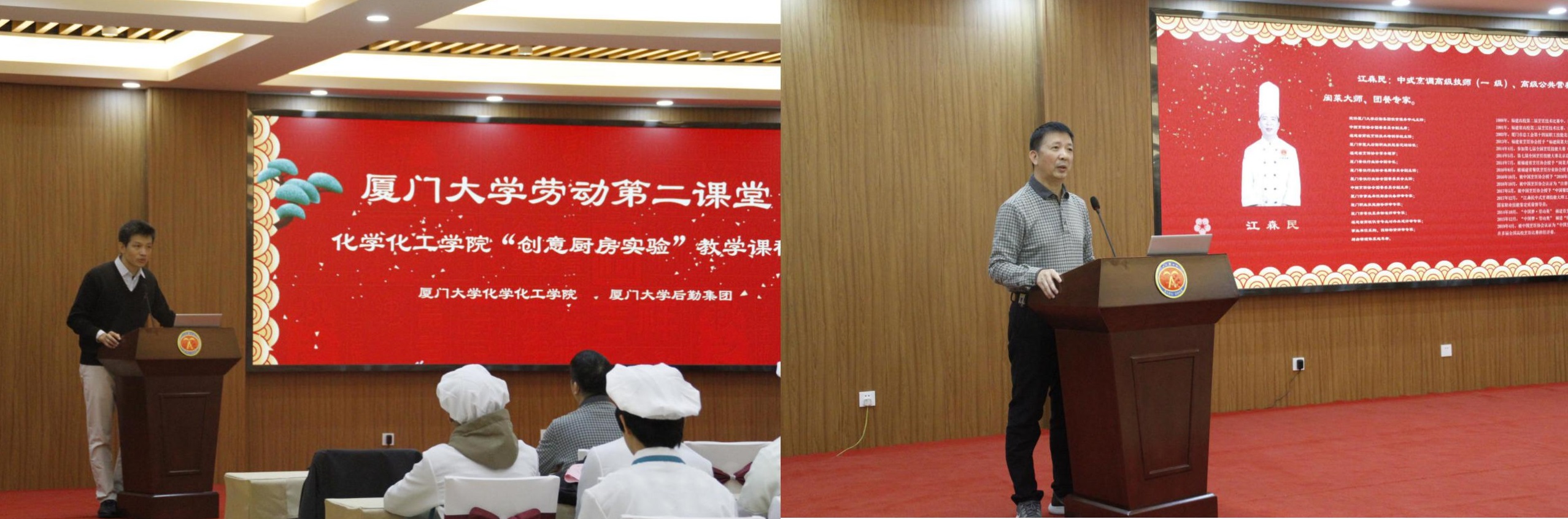 12月27日上午,我院“中心科学”实验班2019、2020级共计60名本科生齐聚东苑餐厅二楼,开展“创意厨房”实验教学课程暨劳动教育第二课堂活动。中国注册烹调大师、厦大后勤集团饮食服务中心主任江森民,厦大后勤集团饮食服务中心培训部副经理洪永健,我院拔尖计划主任曹晓宇教授,杨柳林副教授等出席了本次活动。