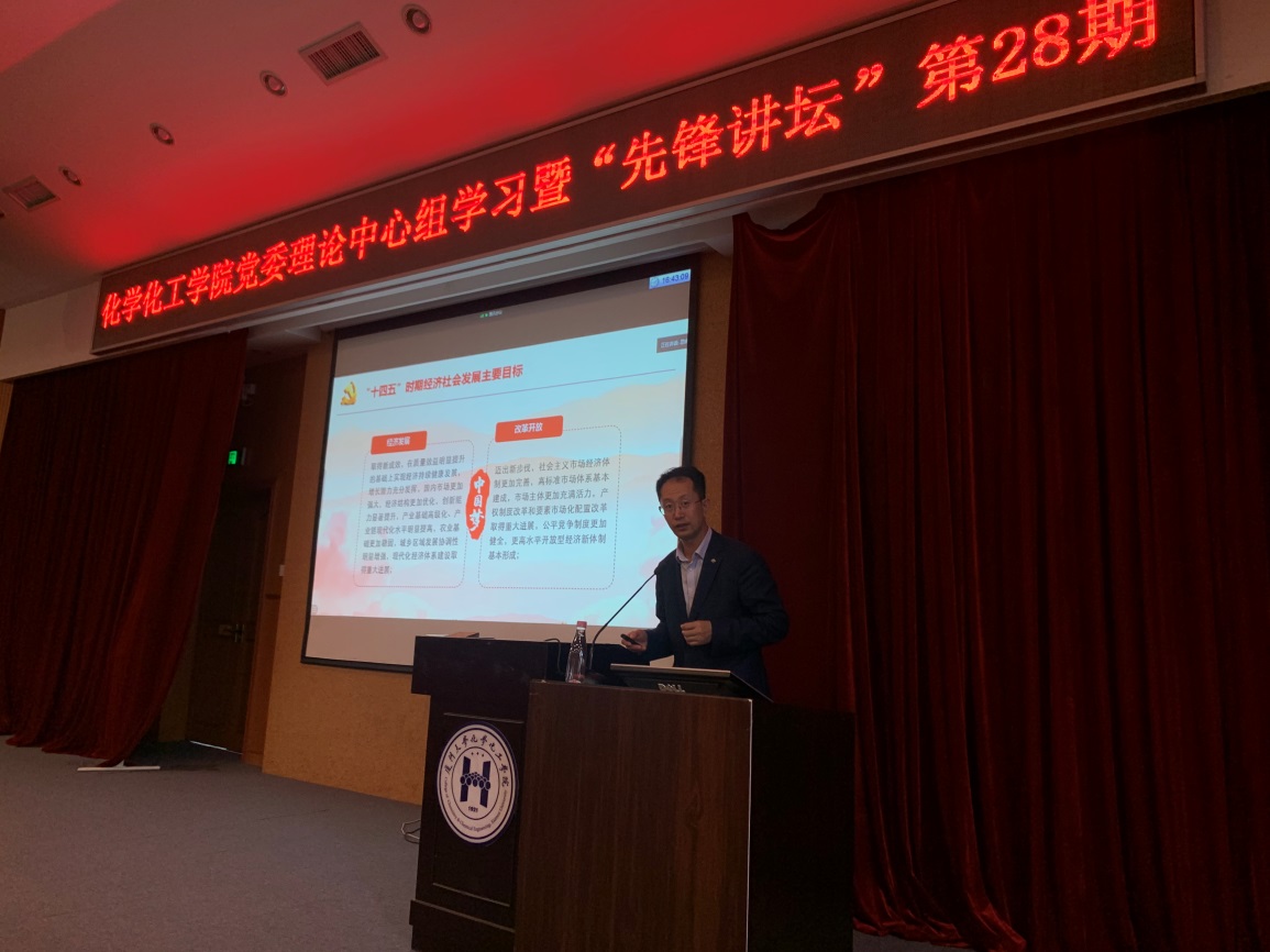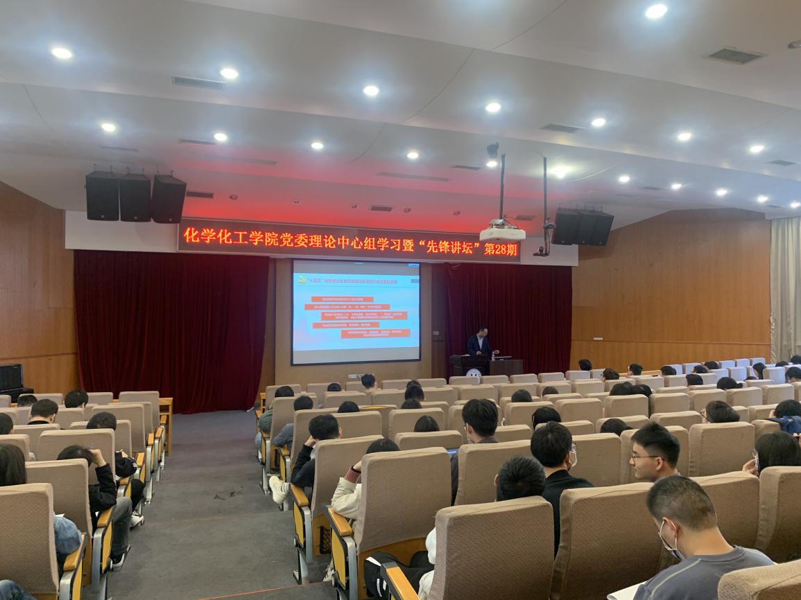 12月29日下午,为深入学习贯彻党的十九届五中全会精神,化学化工学院认真开展“不忘初心、牢记使命”主题教育,在化学报告厅举办学院党委理论学习中心组学习暨“先锋讲坛”第28期讲座,邀请了马克思主义学院张艳涛教授为我院师生作题为“开启全面建设社会主义现代化国家新征程——党的十九届五中全会精神解读”专题辅导报告。学院党委理论学习中心组、党政领导、师生党支部书记、党员200多人参加。报告由学院党委副书记李芬芬主持。