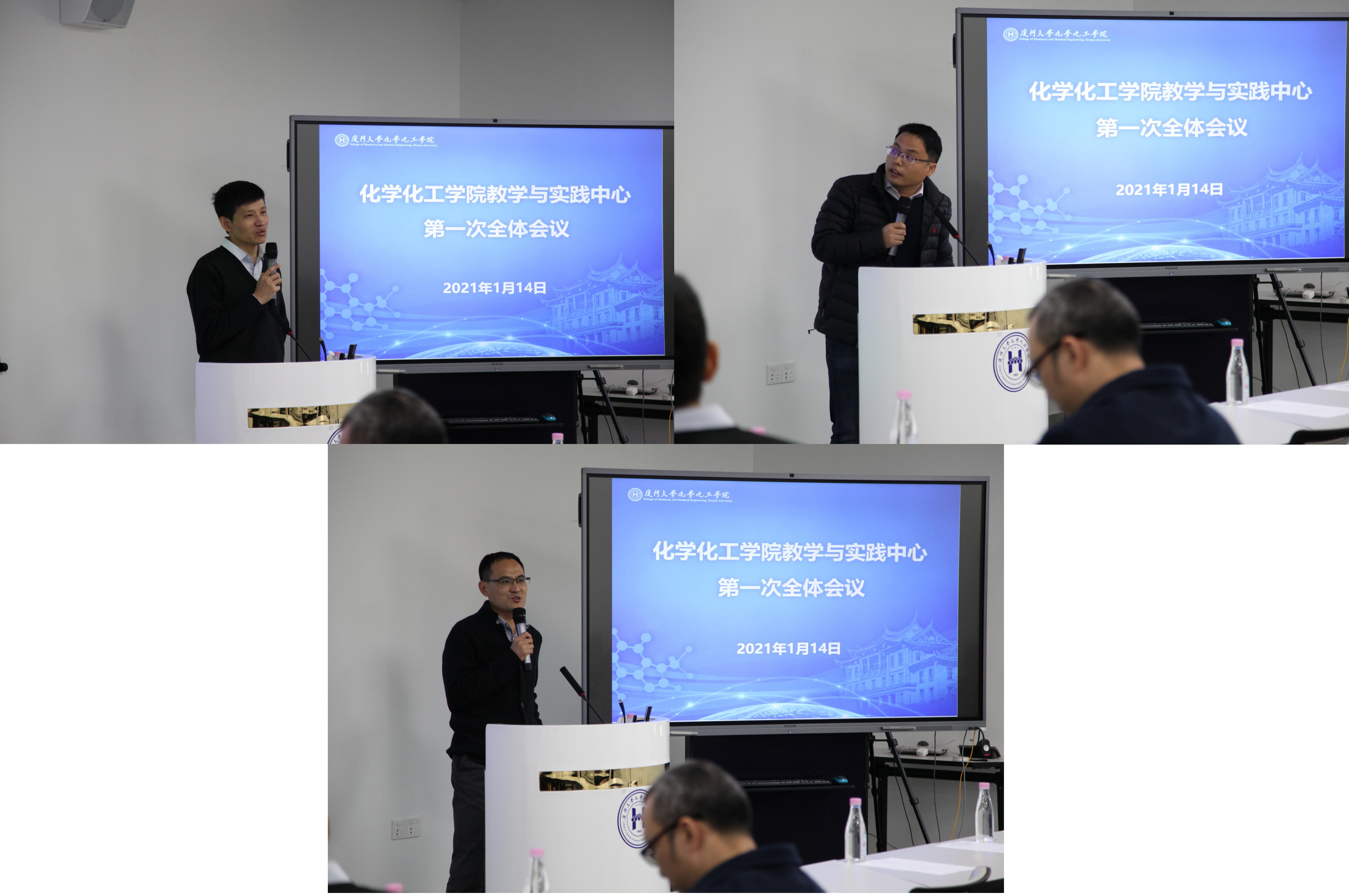 中心常务副主任、化学实验中心主任曹晓宇教授就职感言中回顾了自己从中学时代起与学院以及化学实验中心的渊源,特别感谢了中心老师一直以来对学生的细致关怀与悉心教导,并希望接下来和大家一起迎接挑战。中心副主任、化工实验中心主任张秋根教授系统讲解了化工实验中心接下来的长短期目标与工作任务。中心副主任、分析测试中心主任张洪良教授简要说明了分析测试中心在科研、教学、科普等多方面的重要作用,并同大家分享了创新工作方式方法的几点思考。