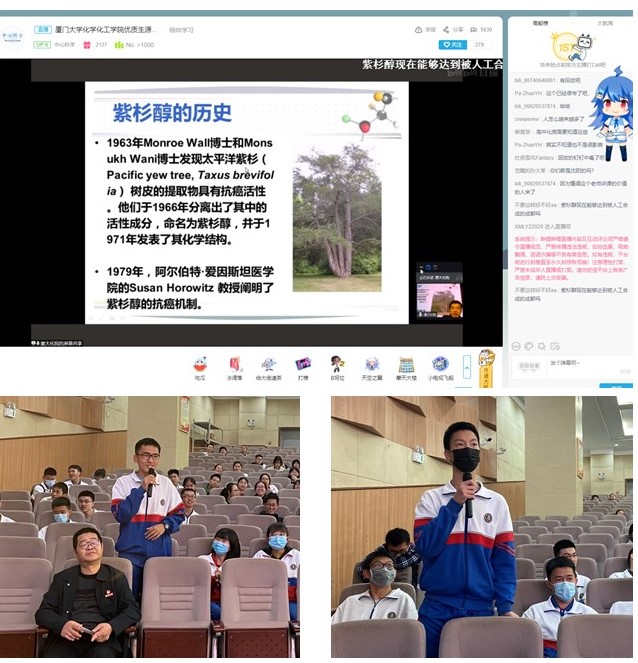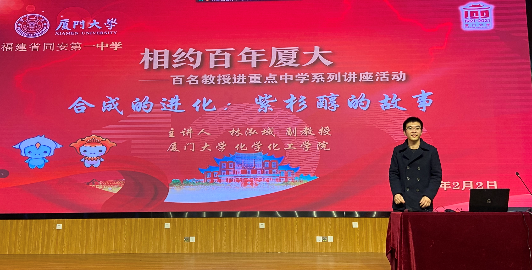 林泓域副教授为同安一中学生作题为《合成的进化:紫杉醇的故事》的科普讲座。讲座采用线上线下同步进行的方式,在哔哩哔哩网站及蔻享学术平台同步直播,累计在线观看人数近7000人次。林泓域结合自身学习经历,循序渐进、深入浅出地为同学们科普了紫杉醇的发现过程、作用机制及其药用价值,讲解了全合成与半合成的区别以及植物细胞发酵生产紫杉醇的全过程。讲座结束后,同学们踊跃提问,林泓域一一作答。林泓域还回忆了自己当年在同安一中的学习生活,鼓励在座同学努力学习、脚踏实地,培养严谨求实的学业作风和勇于创新的科研精神。