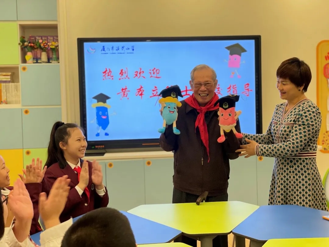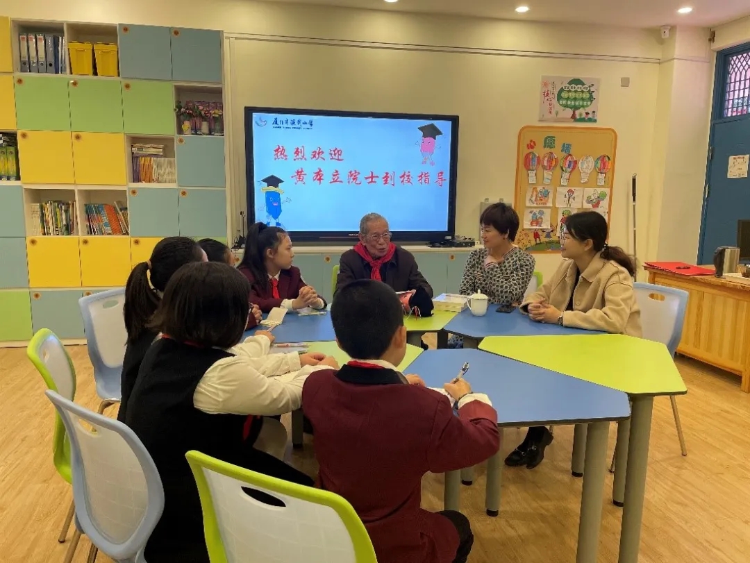 在黄院士温柔目光的注视下,小记者何洪萱认真地问道:“黄爷爷您好,您在1986年调入厦门大学工作,您觉得一线的教育工作给您带来的最大体会是什么呢?”。黄院士望着天真无邪的孩子们语重心长地说:“我认为作为一名教师,最重要的事是教好学生,我十分欣赏韩愈的教育理念——“师者,所以传道授业解惑也。”在漫谈中,黄院士提及西方学者的话语,他表示自己欣赏“吾爱吾师,吾更爱真理”。他说,作为一名科学研究者,要做事认真,实事求是,不要迷信权威,权威并不代表真理,要辩证地看待权威,坚持自我。