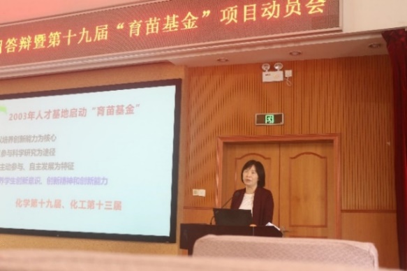 之后,黎朝副教授进行了第十九届“育苗基金”项目动员会,对育苗基金项目以及申报方式进行了介绍。她强调,同课程学习不同,科学研究是不断探索未知的领域,需要同学们主动参与,积极探索。而“育苗基金”正是可以提高个人创新意识、创新精神、创新能力的项目,因此鼓励大家踊跃报名。同时,在化学楼一楼大厅安排了本次“育苗基金”结题项目墙报展,欢迎各位同学观摩学习。