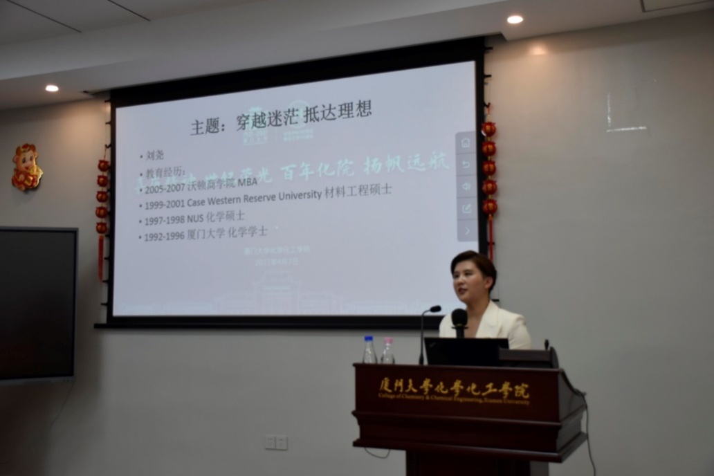 在学院喜迎化学学科创建100周年暨化工系创办30周年之际,天南海北的厦大人奔赴百年之约,纷纷回到厦园参加庆祝活动。2021年4月7日下午3点,1992级化学专业校友刘尧女士在同安二201会议室,做了主题为“穿越迷茫,抵达理想”的职业发展分享会。学院关工委常务副主任潘宝柱、辅导员高世杰和近40名本科生参加分享会,活动由学院党委副书记刘俊杰主持。