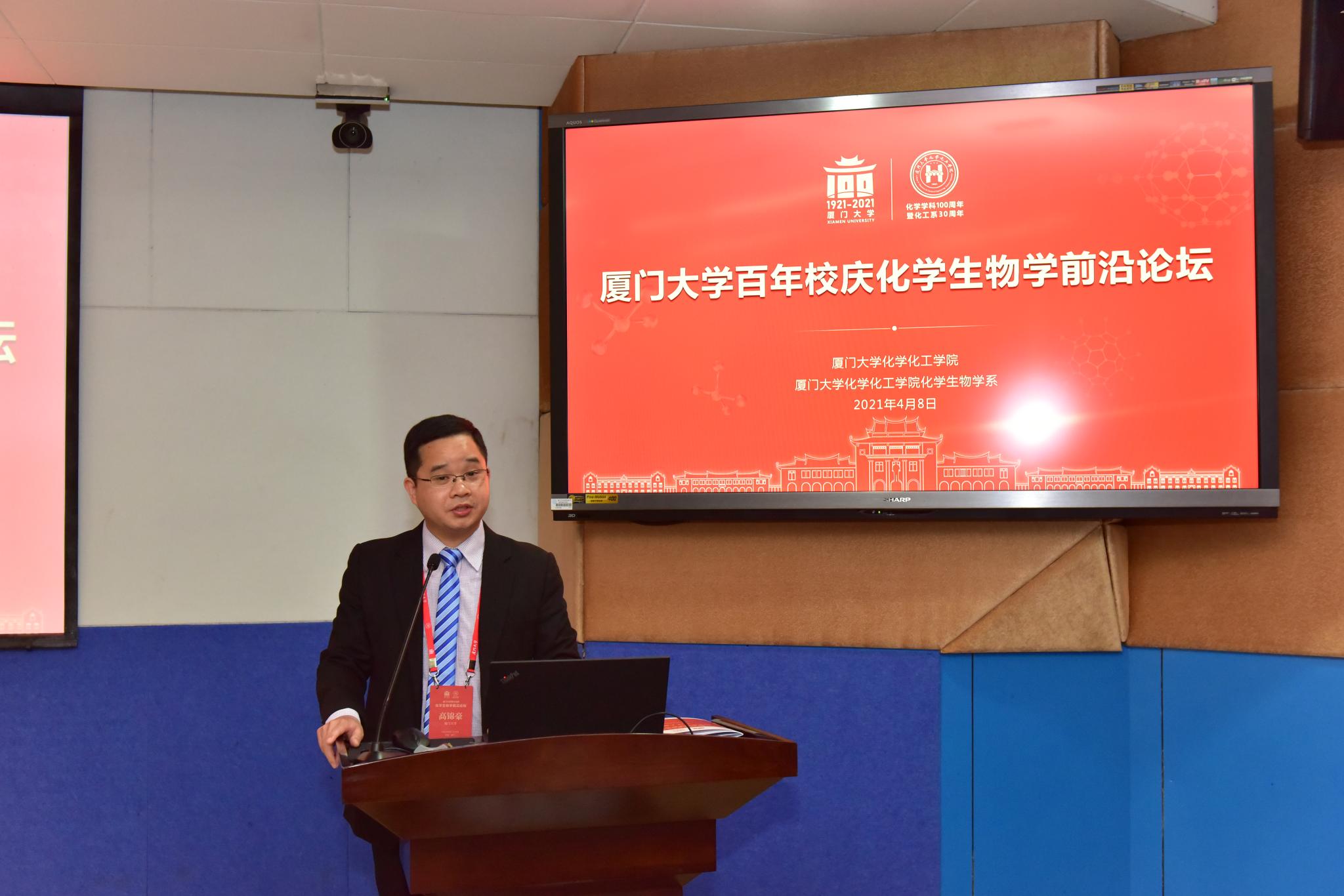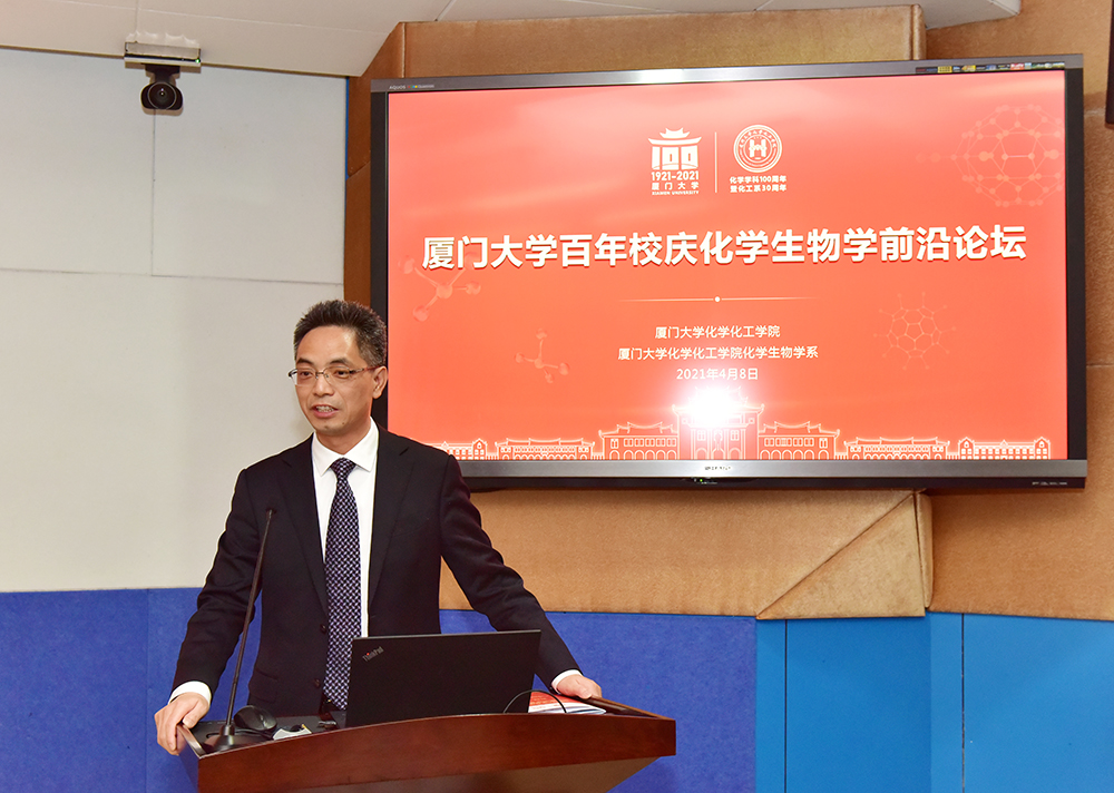 育人育德百春秋,立业立志展四方。值此厦门大学建校100周年暨厦门大学化学学科创建100周年之际,为了推动化学生物学研究领域的交流合作,打造交叉学科融合的新高峰,由厦门大学化学化工学院主办、化学生物学系承办的化学生物学前沿论坛于4月8日在卢嘉锡楼202报告厅成功举行。北京大学张礼和院士、湖南大学谭蔚泓院士、南京大学郭子建院士等来自14个单位的18位化学生物学领域资深专家学者莅临会议并做报告。厦门大学赵玉芬院士、郑兰荪院士、田中群院士,周大旺副校长,化学化工学院谢兆雄院长、任斌副院长和学院部分师生参加了本次论坛。论坛开幕式由化学生物学系主任高锦豪教授主持。