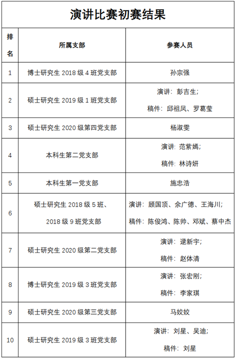 每组选手演讲结束后,8位老师组评委与12位学生党员评委都对选手的综合表现进行打分,评委老师也对选手的表现进行点评并给出修改提升的建议。经过激烈角逐,共有10组同学进入决赛,名单如下: