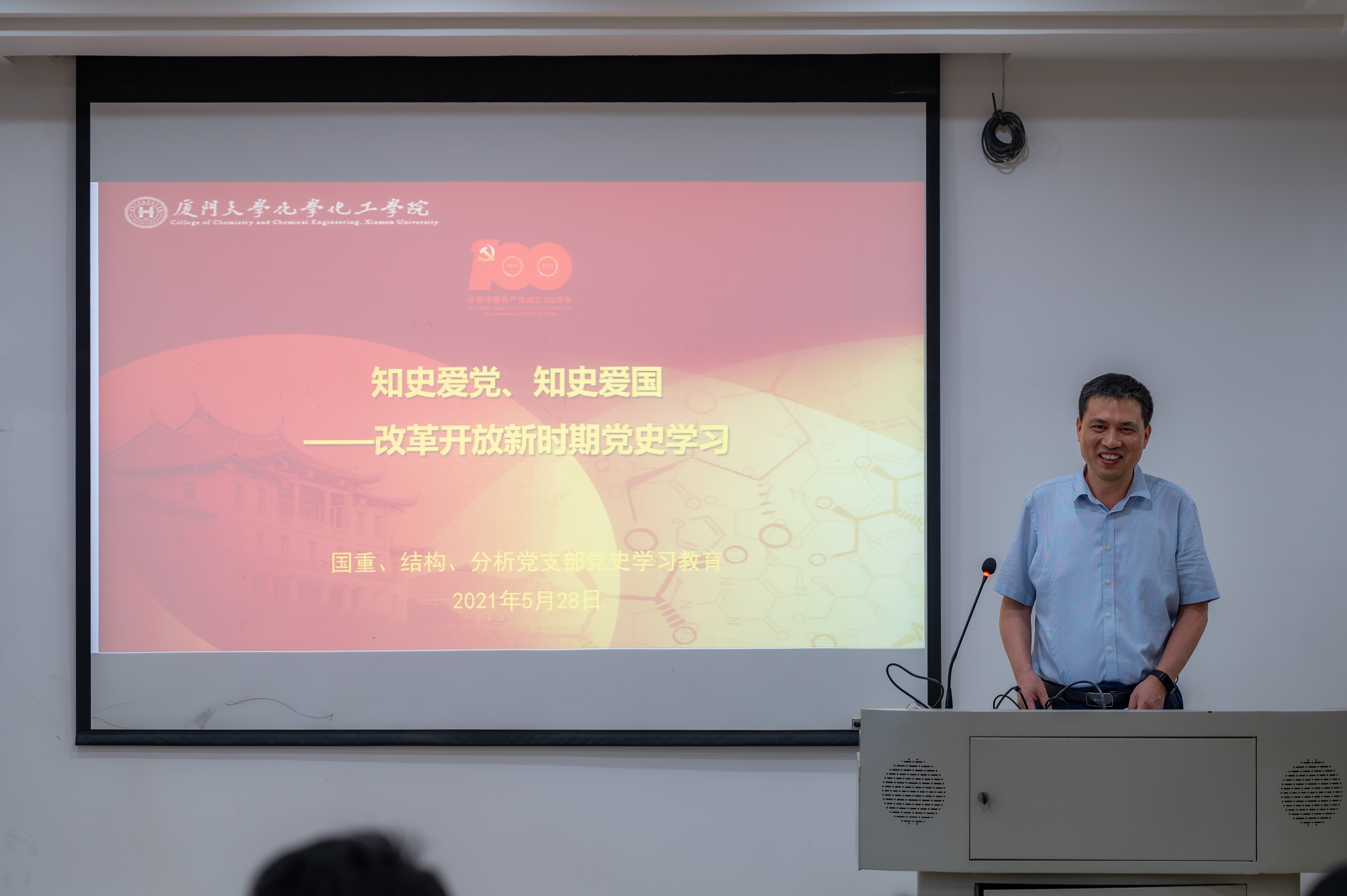 为进一步扎实推进党史学习教育,以更奋发昂扬的姿态迎接建党100周年,5月28日下午,化学化工学院国重室党支部、结构化学教工党支部、分析科学研究所教工党支部在化学楼601联合开展了“知史爱党、知史爱国”党史学习教育,深入讨论学习了“改革开放新时期”历史。化学化工学院党委副书记、院长谢兆雄教授应邀出席并讲授专题党课。